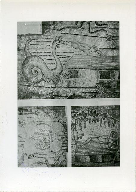 Particolari del mosaico dell'aula sud della Basilica teodoriana di Aquileia decorato con la vicenda del profeta Giona. L'immagine superiore e quella in basso a destra ritraggono i momenti finali della ciclo narrativo: Giona è rigettato dal mostro marino e riposa sotto un pergolato di piante di zucca. Nel riquadro in basso a sinistra è riprodotto invece il medaglione che ricorda la stesura del mosaico da parte del vescovo Teodoro, con la scritta: "Theodore feli[x / a]diuvante Deo omnipotente et poemnio caelitus tibi [tra]ditum omnia baeate fecisti et / gloriose dedicas ti". Attorno alla narrazione si svolge il mare pescoso, brulicante di diverse razze di pesce. Il pavimento si data nella seconda metà del IV sec. d.C.