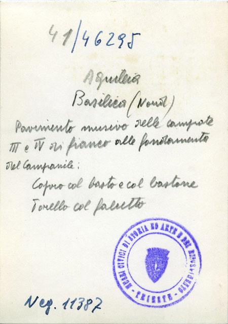 Pavimento musivo dell'aula nord della Basilica teodoriana di Aquileia. La foto è stata scattata in corrispondenza dell'angolo nordoccidentale dell'aula e mostra in primo piano il pannello musivo decorato da una composizione reticolata di fusi e di cerchi tangenti, formante ottagoni concavi irregolari. Questi ultimi presentano riempitivi figurati di cui sono visibili nella fotografia coppie di volatili affrontati a cespi fioriti, un toro che regge un'asta a cui è legato un falcetto e un capro con bastone ricurvo e corno. Nei cerchi vi sono nodi di Salomone e fioroni mentre i fusi sono campiti con fioroni longiformi. A sud il pavimento è interrotto dalle fondamenta del campanile, costruito in un momento successivo. Il pavimento si data nella seconda metà del IV sec. d.C.