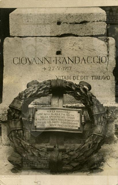 Tomba monumentale di Giovanni Randaccio (1884-1917) presso il Cimitero degli Eroi di Aquileia. Capitano di fanteria sul fronte carsico, G. Randaccio fu compagno e amico di Gabriele D'Annunzio, con il quale fronteggiò le battaglie dell'Isonzo. Morì durante la Decima battaglia dell'Isonzo nel tentativo di occupare le rovine del castello di Duino, posto oltre il corso del Timavo. Fu sepolto ad Aquileia e fu D'Annunzio stesso a idearne l'epitaffio "vitam dedit Timavo" inciso ai piedi del monumento, forse ispirandosi all'epigrafe romana scritta nel 129 a.C. per commemorare la vittoria sugli Istri, oggi conservata al Museo Archeologico Nazionale di Aquileia.