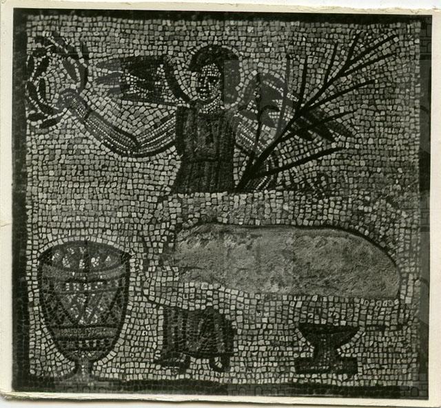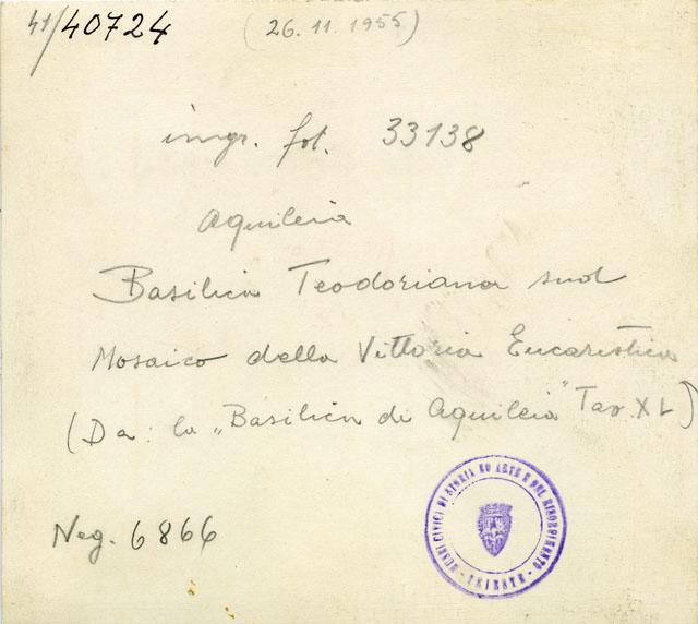 Particolare del mosaico che orna l'aula sud della Basilica teodoriana di Aquileia. Il dettaglio si riferisce al pannello musivo posto al centro dell'aula, in prossimità del noto tessellato con la vicenda del profeta Giona, caratterizzato da una composizione ortogonale di ottagoni e di rettangoli adiacenti, formanti piccoli ottagoni irregolari. Lo schema è interrotto al centro da un riquadro campito dalla raffigurazione di una Vittoria alata, visibile nella fotografia, che trattiene nelle mani una corona e un ramo di palma; ai suoi piedi vi sono un cesto colmo di pani e un altro recipiente che un restauro antico realizzato in tessere bianche non permette di identificare. Il pavimento si data al secondo decennio del IV sec. d.C.