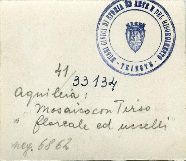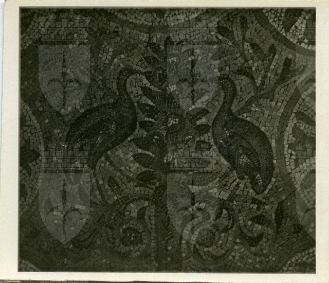 Particolare del mosaico dell'Aula Nord della Basilica di Aquileia. Il dettaglio qui riprodotto mostra una coppia di volatili affrontati ai lati di un trofeo vegetale inseriti all'interno dello spazio ottagonale di risulta creato dal reticolato di fusi e cerchi tangenti. Il particolare appartiene al pannello centrale dell'articolato pavimento musivo dell'aula teodoriana e si data al secondo decennio IV sec. d.C.