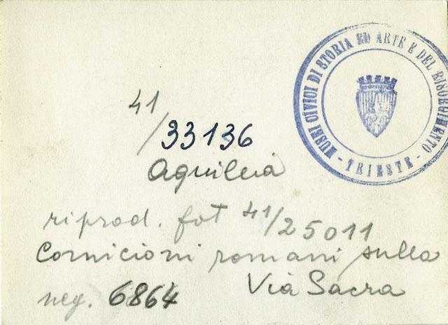 Trabeazione marmorea (II sec. d.C.) rinvenuta durante gli scavi del porto fluviale di Aquileia, innalzata su robusti pilastri di mattoni lungo il percorso della Via Sacra nel 1934.