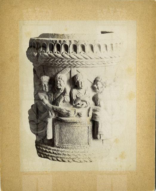 Cippo funerario in calcare di Aurisina che imita un cesto di vimini nei cordoli posti alla base e nella parte superiore, a cui si somma una decorazione a bacellature che rimanda invece alla lavorazione in terracotta o in bronzo.Nella porzione centrale si svolge una scena di banchetto funebre all'aperto, come sembrano suggerire le assi lignee riprodotte sullo sfondo. La raffigurazione è resa in modo realistico: attorno a un tavolo rotondo si colloca il letto tricliniare sul quale giacciono reclinati, sorretti con il braccio sinistro, i convitati, due coppie composte da un uomo e una donna. Nella porzione retrostante, non visibile nella foto (cfr. F17187), completano la scena un musico che suona il doppio flauto, un servo che porta un paniere di frutta e un'ancella intenta a preparare le bevande e i tovaglioli.La scena è connotata da notazioni reali e da dettagli veristici, evidenziati dal gesto di scongiuro della donna di destra e del servo, che rappresenta una reazione spontanea a qualcosa che è stato detto o fatto probabilmente da uno degli altri convitati. È possibile che l'urna non venne mai usata in quanto la tabella posta sotto al tavolo, che solitamente reca l'iscrizione funeraria, è invece vuota. L'opera è databile alla fine del I sec. a.C.La fotografia è stata utilizzata da V. Scarpa per realizzare il disegno pubblicato nel volume di Caprin, "Pianure friulane" (1892).