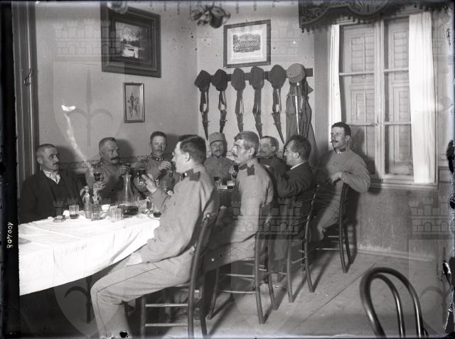 Soldati austriaci ad Aurisina mentre brindano seduti a tavola.