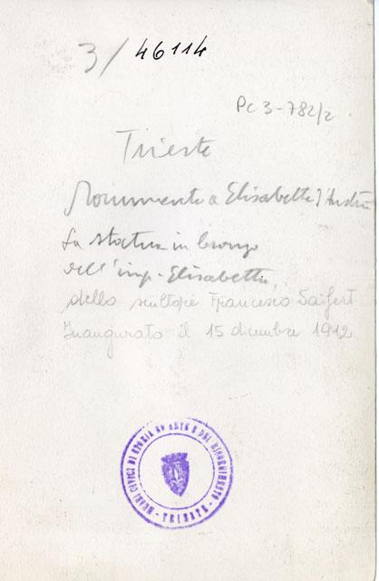 Monumento a Elisabetta imperatrice d'Austria, autore Franz Seifert (1866-1951), inaugurazione 12 o 15 dicembre 1912 a Trieste in Piazza dell stazione, nel luogo dove in seguito sorgerà la Stazione delle autocorriere (Palatripcovich), ora demolita. In bronzo e marmo di Carrara, fu realizzato con la sottoscrizione della città per la scomparsa dell'imperatrice. A fianco della figura di Elisabetta compaiono l'Allegoria delle arti e della natura e l'Omaggio del popolo alla sovrana.Il monumento fu rimosso nel 1921 e ricollocato nel giardino antistante l'ingresso principale della Stazione ferroviaria il 5 ottobre 1997.Il bozzetto in gesso del monumento è conservato presso la Gipsoteca dei Civici musei di storia ed arte. Testo tratto da L'osservatore triestino, 16 dicembre 1912: Figura in bronzo, i due altorilievi in marmo di Carrara, il basamento in pietra di Repentabor. L'altorilievo di sinistra raffigura l'omaggio del popolo: fanciulle avvolte in vesti ideali s'appressano alla Sovrana in atto di offrirle gran copia di fiori. Dietro a loro una giovane donna accompagnata dal consorte tiene in braccio un lattante il quale stende le manine verso l'Imperatrice, mentre un altro bambino dietro alla mamma guarda l'Augusta, e ne spunta un terzo. Si chiude con una coppia di popolani dell'lstria che con passo affaticato s'avvia verso il trono ... A destra l'artista ha simboleggiato genialmente il culto dell'Imperatrice per le arti e le bellezze della natura. La Poesia scioglie il velo per discoprire il viso della Sovrana, lo Pittura tiene in alto il lauro, mentre un'altra se ne sta pensosa presso un'opera appena iniziata: una testa di Achille, dietro alla quale appare lo figura di Pallade Atena, figurazione riprodotta da un'opera che trovasi nella Gipsoteca di Monaco. Poi una figurino muliebre con le alucce di farfalla, la testolina ricadente all'indietro e gli occhi chiusi, rappresenta Psiche. Una figura marina offre alla Sovrana i doni del mare, mentre una ninfa sta in atto di ammirazione. Sullo sfondo si stende il mare, sì intensamente amato da Elisabetta, e laggiù su uno scoglio torreggia lo rovina di un tempio ellenico, allusione alle classiche architetture dell'Achilleion di Corfù. Il monumento è largo 11 metri e profondo 5,1 lo statua e alta 2,180 circa. Prima si trovano quattro gradini, poi lo zoccolo con lo semplice scritta "Elisabetta" in lettere di bronzo in rilievo. Altri quattro gradini salgono al trono. La statua ed il trono adorno di rose e di lauro sono di bronzo e sono usciti dalla fonderia Frommel di Vienna. Il corpo architettonico è in pietra di Repentabor presso Trieste lavorata nelle officine Purich della nostra città.