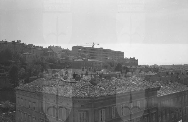 Il nuovo Poliambulatorio INAM di via Farneto fotografato da via Kandler. Il poliambulatorio presenta un innovativo impianto planimetrico a L. Sul retro: il sanatorio immerso nel giardino, sulla strada i sette piani destinati all'ambulatorio.