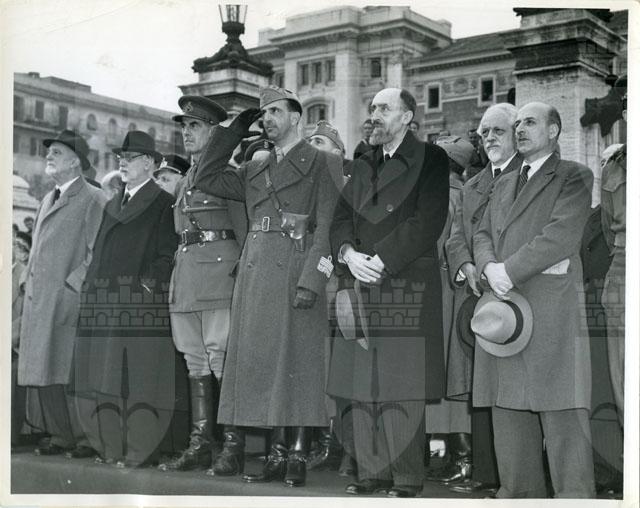 Il principe Umberto II di Savoia presiede la parata del nuovo esercito con i ministri Ivanoe Bonomi, Alessandro Casati, Umberto Tupini, il senatore Carlo Sforza