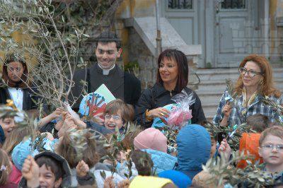 Angela Brandi e padre Paolo Rakic assieme ai bambini della scuola ed all'alberello di ulivo