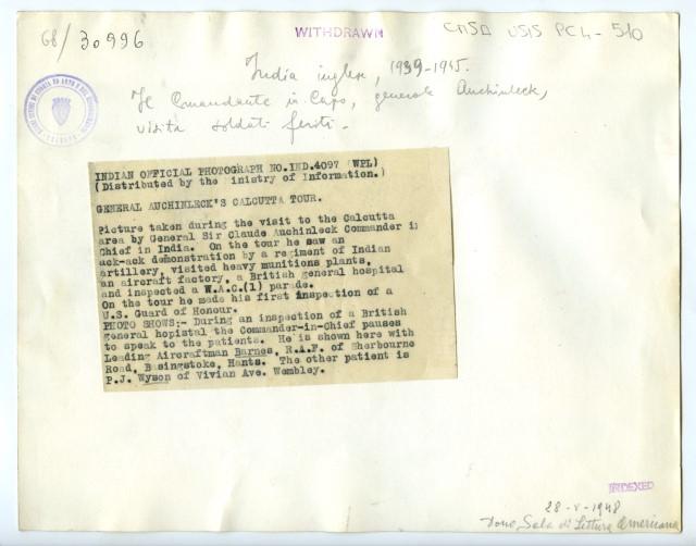 Visita del Generale Claude Auchinleck, comandante in capo in India. La foto rappresenta la visita all'ospedale da parte del generale ai pazienti.