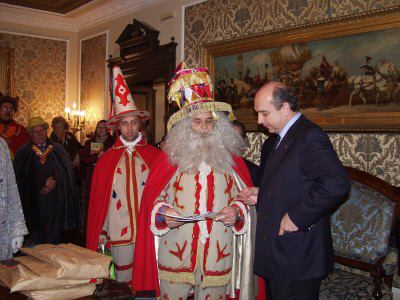Il sindaco Roberto Dipiazza, l'assessore Maurizio Bucci e Roberto De Gioia presidente del Comitato «Trieste in Palio» incontrano il gruppo di maschere