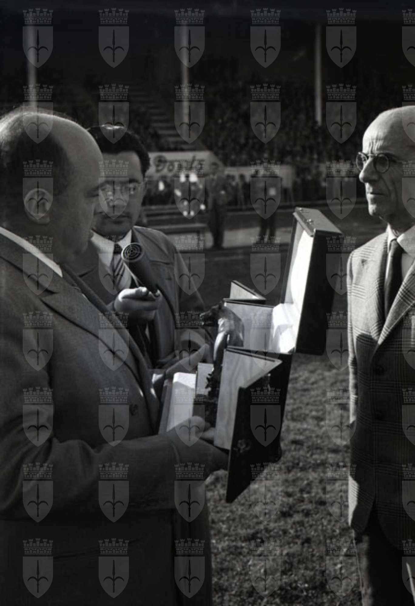 La squadra romana consegna la lupa in bronzo con una targa sulla quale sono espressi i sentimenti degli sportivi romani auspicando il prossimo ricongiungimento di Trieste all'Italia. Testo tratto dal Giornale di Trieste, 1.11.1953