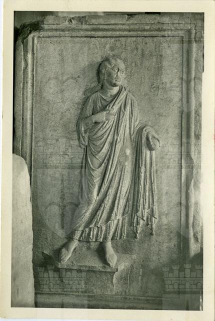 Ritratto di donna che orna uno dei lati dell'ara di Ti. Claudius Germanus, come cita l'iscrizione apposta sulla fronte, malamente conservata: Ti(berius) Claudius Germanus pet Iulia Q(uinti) l(iberta) Proc(i)ne v(ivi) f(ecerunt) Ti(berio) Claudio Ti(beri) f(ilio) Proculo ann(orum) XXVII Iuli(ae) matr(i) et M(arco) [---]vio Adiutori, VIvir(o). La figura, rivolta verso destra, è ritratta stante sopra un plinto a trapezio rovescio, con i capelli lunghi raccolti in una coda. Trattiene nella mano sinistra un frutto, o forse una palla, data la stranezza del gesto che non accenna a offrire il contenuto della mano ma lo tiene volgendolo in basso. Sul lato opposto è ritratto un uomo che stringe in mano le "tabulae ceratae". Per l'impostazione delle figure, la tecnica e lo stile, contraddistinto da un pittorico naturalismo, la stele si data alla piena età claudia.
