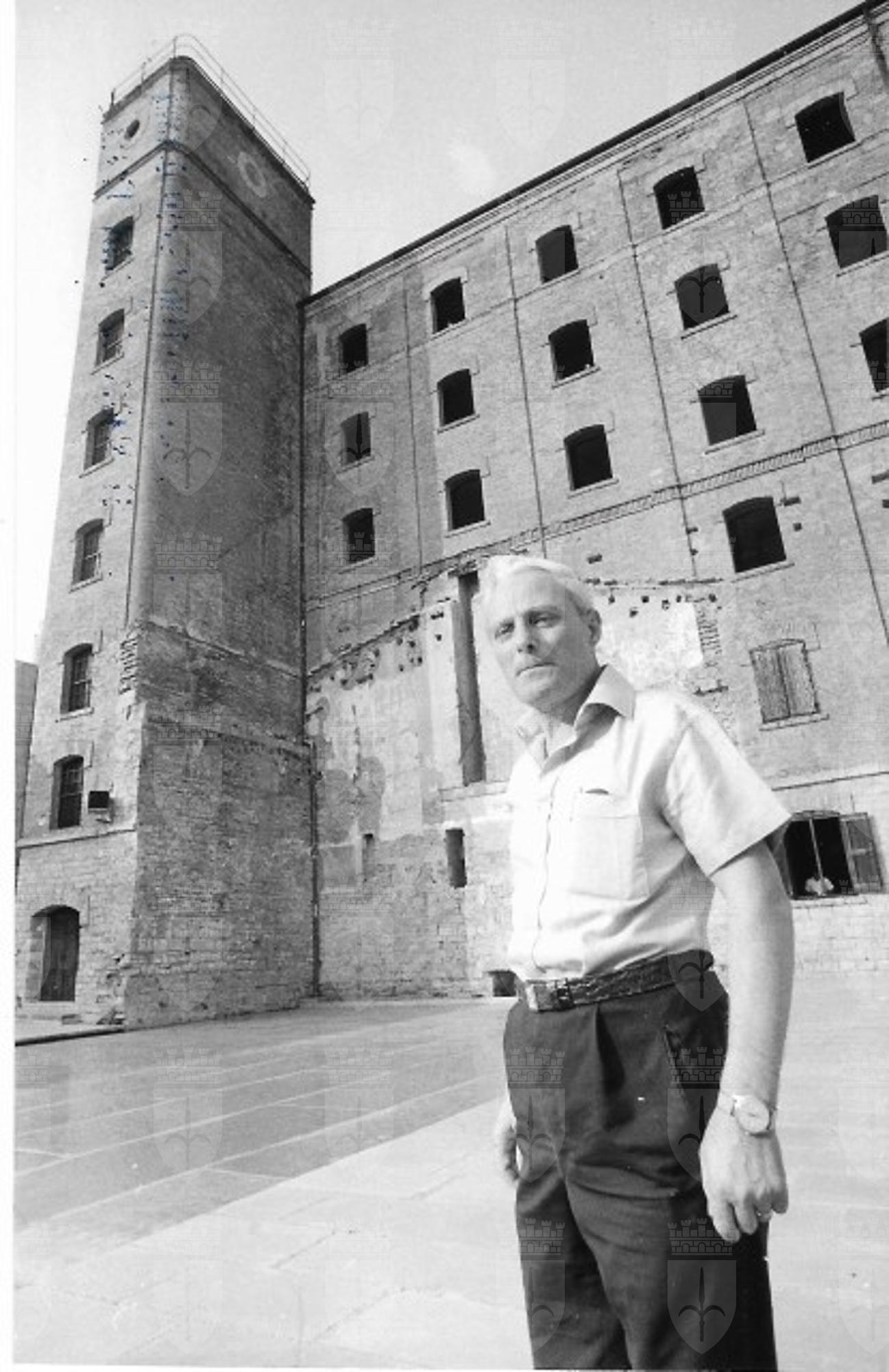 Mario Montanaro in cortile. Edificio centrale e piastra del forno sullo sfondo