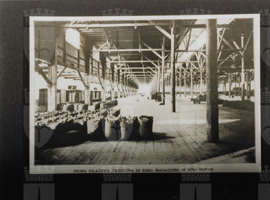 Riproduzione fotografica degli edifici della pilatura del riso, dei magazzini