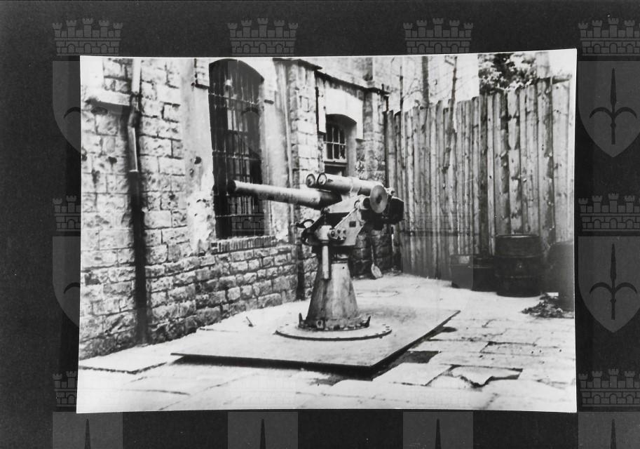 Riproduzione fotografica del cannone antiaereo tedesco nel cortile della Risiera