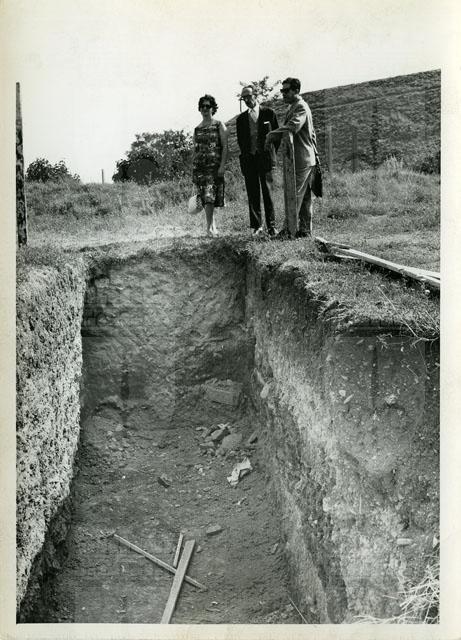 Scavo archeologico di Stramare realizzato dalla Soprintendenza sotto la direzione di Dante Cannarella tra il 1962 e il 1964. /pLa trincea mostra in sezione una stratificazione che dall'età romana risale all'età del Ferro e a quella del Bronzo. In visita allo scavo sono il direttore del Museo, il professore Silvio Rutteri, tra il consevatore del Museo, la dottoressa Laura Ruaro, e Dante Cannarella.