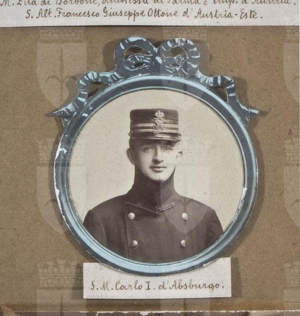 Positivo originale collocato con altri ritratti in una grande cornice dorata dello studio fotografico Zanutto con cartiglio Premiata Fotografia Zanutto : 1862-1917