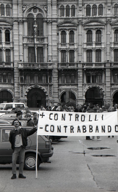 Fini, Menia, Alleanza Nazionale, fronte della gioventù. Piazza Unità Frecce Tricolori. Sciopero tabacchi, sigarette. Sciopero contro razzismo. Rabuiese, Carnevale Muggia, pope, Piazza Marconi.