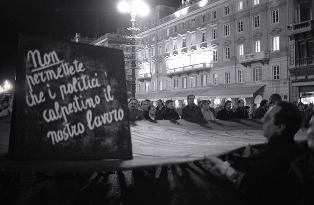 Sala Tripcovich, carrozza, cavalli, portici di Chiozza. Piazza Unità, operai, ferriera. Università, studenti. Tomizza, Turello, Biasutti, tribunale. Negozi, compratori slavi.
