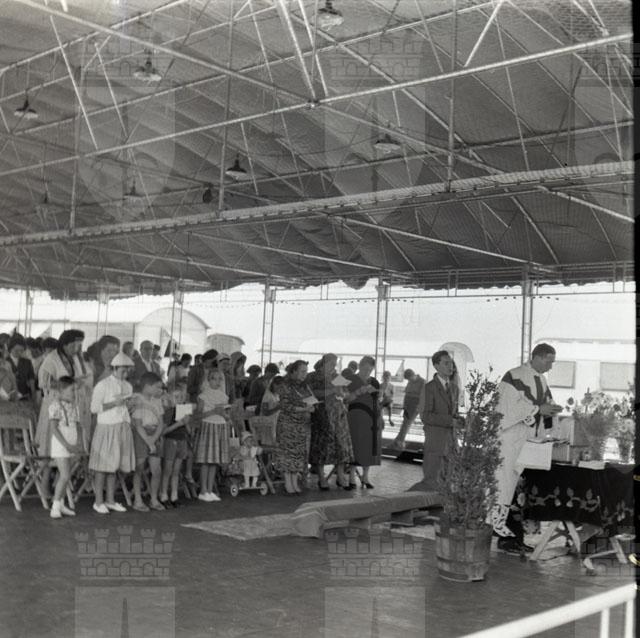 Viene celebrata una Messa sotto il tendone di un luna-park.