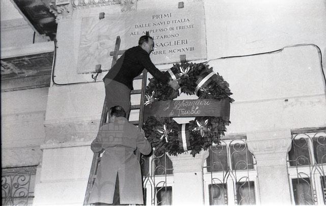 Deposizione di corone della Associazione Nazionale Bersaglieri, sezione Enrico Toti di Trieste, sotto la targa che ricorda lo sbarco, dall'incrociatore Audace, dei bersaglieri a Trieste il 3 novembre 1918