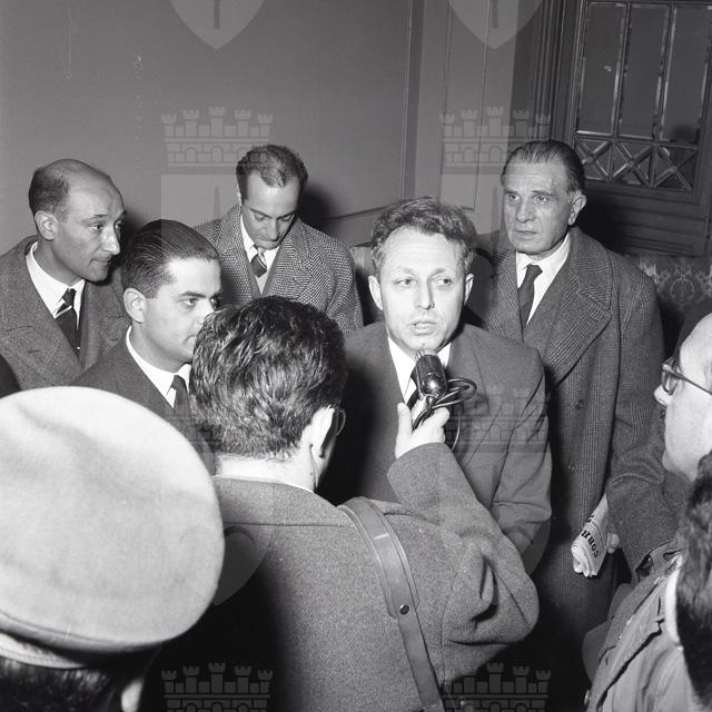Mario Martinelli (Como, 12 maggio 1906 - 21 maggio 2001), senatore della Repubblica, deputato della Costituente, per sei volte ministro, fu esponente del Partito Popolare prima e della Democrazia Cristiana in seguito. Nel servizio fotografico Martinelli, ministro del Commercio con l'estero, viene accolto a Trieste dal sindaco Bartoli, reduce da una missione effettuata a Belgrado il 7 e 8 dicembre 1954. Questa missione, in cui si incontrò col vicepresidente jugoslavo Kardely (il maresciallo Tito era in missione di Stato in India), determinò un'autentica svolta nelle relazioni fra Italia e Jugoslavia che si concretizzò nell'accordo per la stipula di un nuovo trattato commerciale