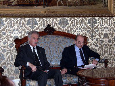 Il sindaco Roberto Dipiazza, Giuseppe Lo Duca allenatore, e Franco Bandelli consigliere comunale e presidente dell'AIAT