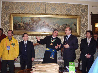 Il sindaco Roberto Dipiazza, l'assessore Maurizio Bucci e Roberto De Gioia presidente del Comitato «Trieste in Palio» incontrano il gruppo di maschere