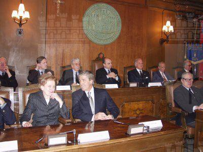 Nella sala del Consiglio Comunale il sindaco Roberto Dipiazza consegna il premio ad un giovane atleta azzurro, i giocatori nazionali di pallamano di Trieste, Irene Camber e Nino Benvenuti