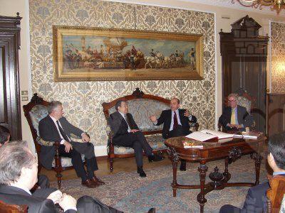 Il sindaco Roberto Dipiazza sindaco e l'assessore comunale Giorgio Rossi ed il presidente del Consiglio comunale Bruno Sulli incontrano l'ambasciatore cinese Chen Wen Dong, nel salotto azzurro del Municipio.