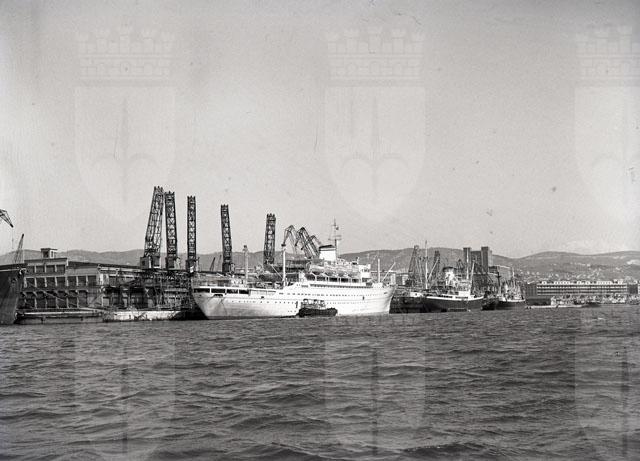 Vista del porto Duca d'Aosta con ormeggiate molte navi : Africa, Risano, Sebastiano Caboto (tutte di proprieta' del Lloyd Triestino di navigazione) e Etna.