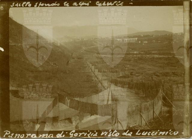 Il ponte ferroviario che corrisponde alla descrizione è il Ponte di Salcano (oggi Ponte di Solkan in Slovenia) sull'Isonzo. Durante la Sesta Battaglia dell'Isonzo nell'agosto 1916, le truppe austro-ungariche in ritirata lo fecero esplodere, distruggendone una campata per impedire l'avanzata italiana. Dopo la conquista di Gorizia, venne ripristinato in modo temporaneo con una struttura metallica, per poi essere ricostruito nella sua forma originale in pietra solo a fine guerra, rendendolo il ponte in pietra ad un arco più lungo del mondo. Panorama di Gorizia ripreso da Lucinico. Sullo sfondo il ponte ferroviario sull'Isonzo con una campata distrutta.