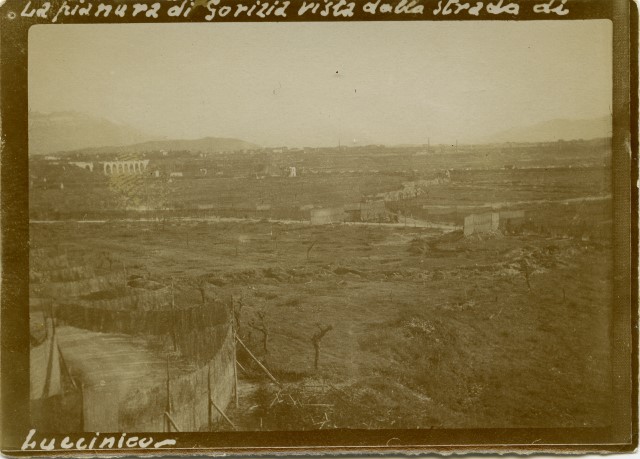 La piana di Gorizia ripresa da Lucinico. Sullo sfondo il ponte ferroviario sull'Isonzo con una campata distrutta.