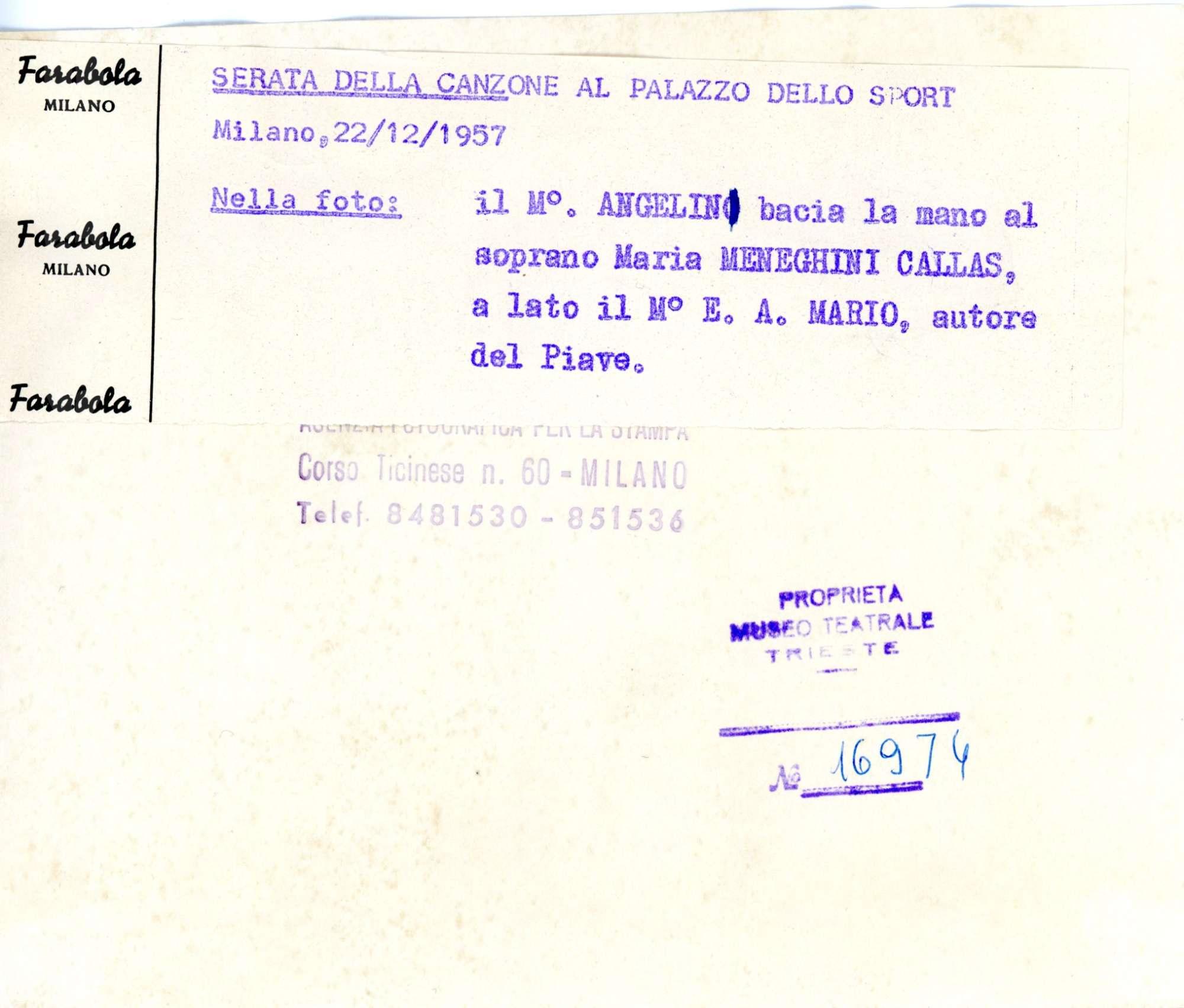 Maria Meneghini Callas, Cinico Angelini e Giovanni Ermete Gaeta (E. A. Mario) autore del Piave, alla Serata della Canzone al Palazzo dello Sport, Milano 22/12/1957