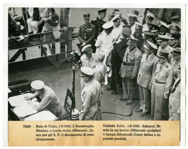 Sulla nave «Missouri», attraccata nella baia di Tokyo, il 01/09/1945, il comandante della Marina americana Chester W. Nimitz firma il documento della resa del Giappone.