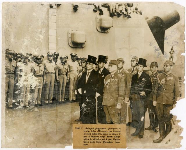 La delegazione giapponese, guidata dal Ministro degli Affari Esteri Mamoru Shigemitsu e dal Generale Yoshijirō si trova sul ponte della nave americana Missouri per firmare la resa del Paese nel settembre 1945.