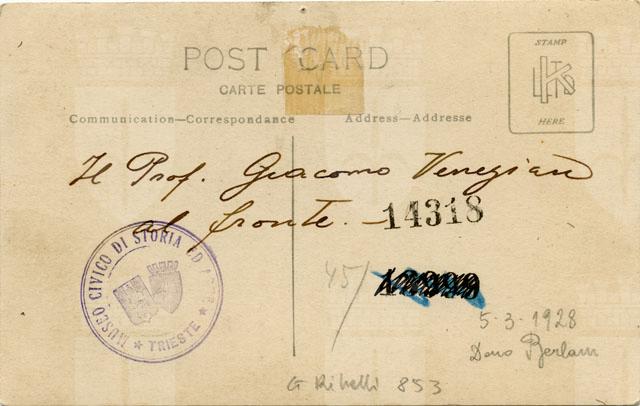 Giacomo Venezian, nato a Trieste nel 1861. Professore ordinario di diritto civile alla Regia Università di Bologna. Allontanatosi giovanissimo da Trieste alimentò l'irredentismo nell'Ateneo Bolognese. Si arruolò volontario il 24 maggio 1915. A capo di un battaglione del 121° Rgt. fanteria con il grado di maggiore, cadde il 20 novembre 1915 sul Carso, al Ridottino dei Morti a Case Marcottini. Uno dei due positivi è Albo Bologna