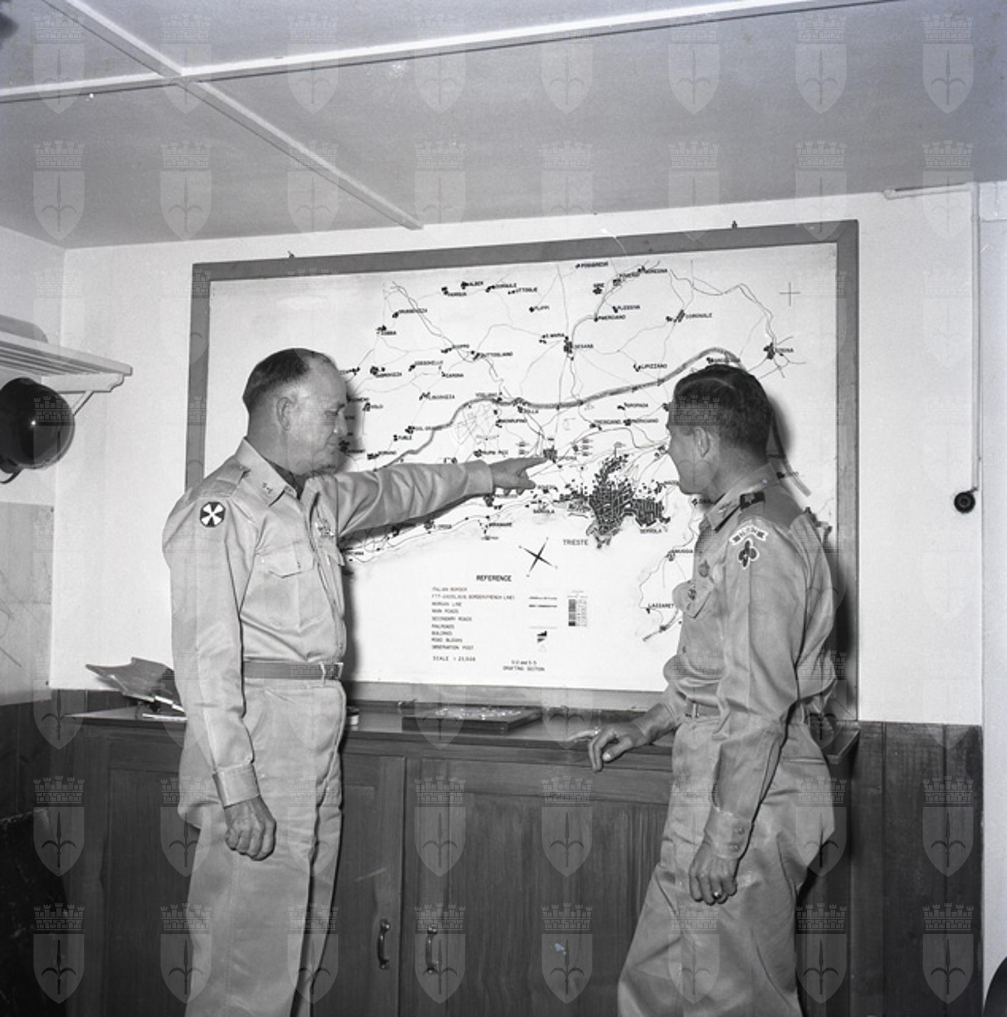 Il generale John A. Dabney, comandante delle truppe americane, predispone lo sgombero delle truppe statunitensi e viene immortalato davanti alla carta del Territorio. Il fotogramma UBNP000981_004 è pubblicato su Il Giornale di Trieste senza l'indicazione dell'autore.
