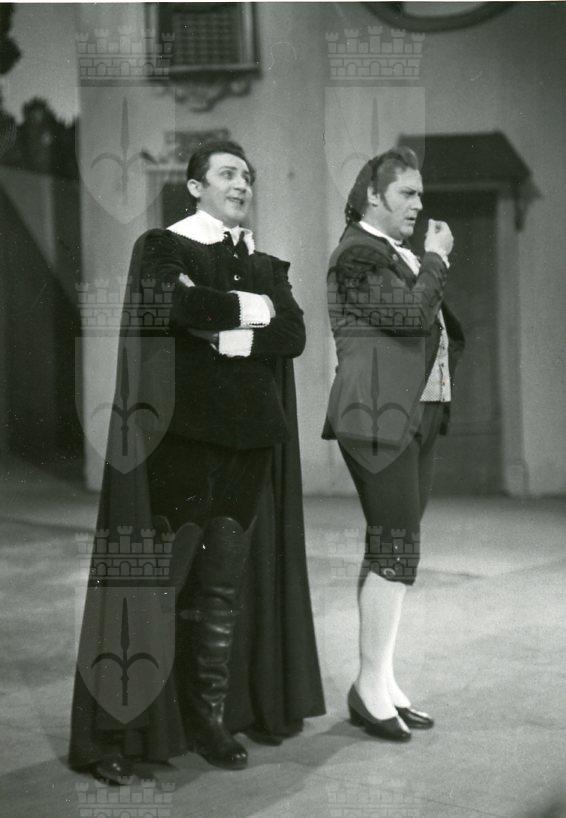 Umberto Grilli nel ruolo del Conte di Almaviva (a sx.) e Sesto Bruscantini nel ruolo di Figaro in Il Barbiere di Siviglia, Teatro Verdi, stagione 1963/64
