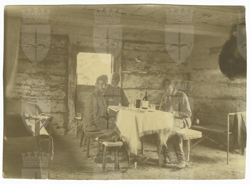 Gli ufficiali dello squadrone tecnico del 12. Reggimento Ulani dopo il pranzo: il tenente Juhasz, il capitano Chiachich e il sottotenente Grafi. Si pranza in una casa danneggiata e presto riparata