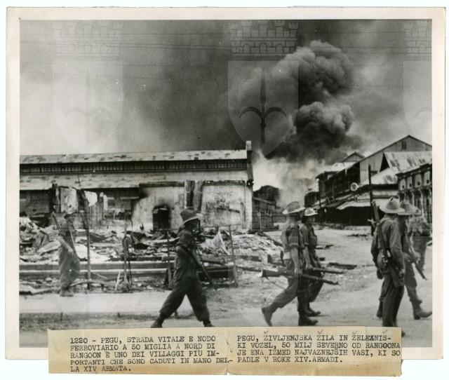 Truppe britanniche che marciano nella città di Pegu