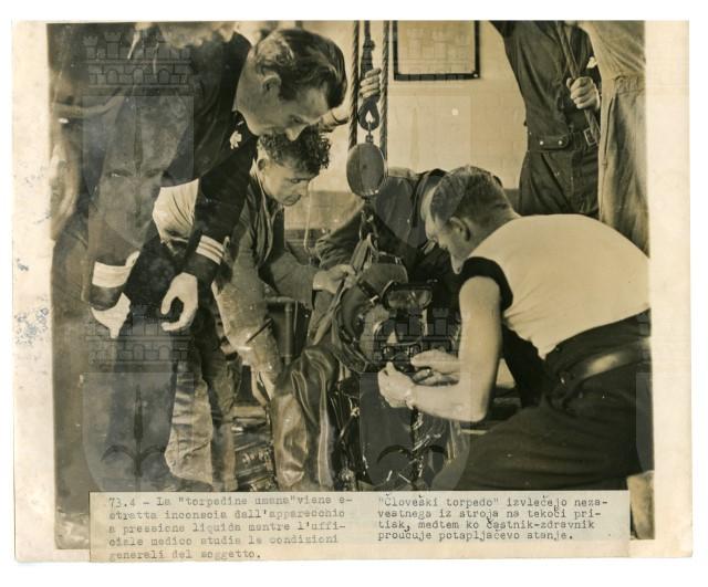 La "torpedine umana" viene estratta inconscia dell'apparecchio a pressione liquida mentre l'ufficiale medico studia le condizioni generali del soggetto