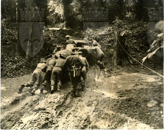 Troops pushing vehicles through the mud