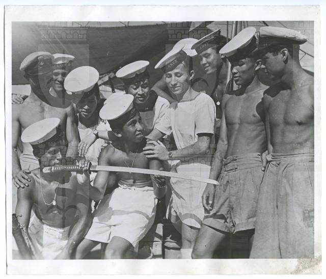 Marinai inglesi osservano la spada di un ufficiale giapponese appena catturato