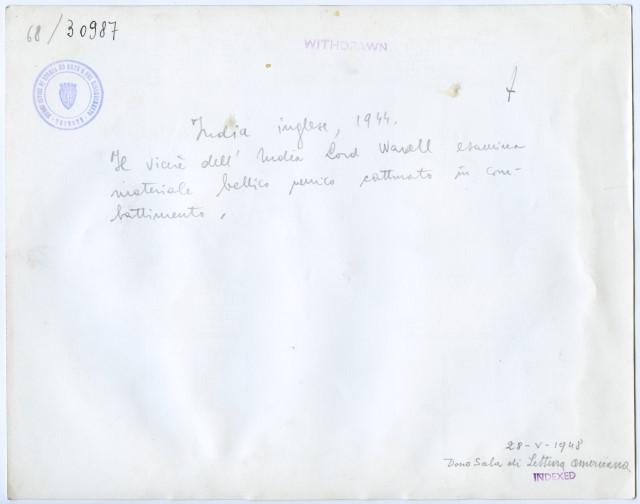 Wavell, Archibald Percival, visconte di Winchester e di Cirenaica, lord. - Generale (Colchester 1883 - Londra 1950). Partecipò alla guerra contro i Boeri (1899-1902) e alla prima guerra mondiale, servendo poi in Egitto con il gen. E. H. H. Allenby e nel corpo di occupazione sul Reno (1919-20). Richiamato al War Office e inviato più tardi in Rhodesia del Sud, nel 1939 fu nominato comandante in capo delle forze britanniche nel Medio Oriente. In tale veste diresse le operazioni contro gli Italiani in Cirenaica (dic. 1940 - genn. 1941) e in AOI (genn.-maggio 1941) costringendoli alla ritirata; ma non riuscì ad arrestare l'invasione tedesca della Grecia e di Creta, né a fermare le truppe di Rommel in Nord Africa. Trasferito (luglio 1941) al comando in capo delle forze britanniche delle Indie, dovette indietreggiare di fronte all'avanzata giapponese in Malesia, Singapore e Burma. Lasciato il comando nel giugno 1943, fu promosso maresciallo di campo e nominato vicerè dell'India, carica che mantenne fino al 1947. Notizia desunta da: http://www.treccani.it/enciclopedia/wavell-archibald-percival-visconte-di-winchester-e-di-cirenaica-lord