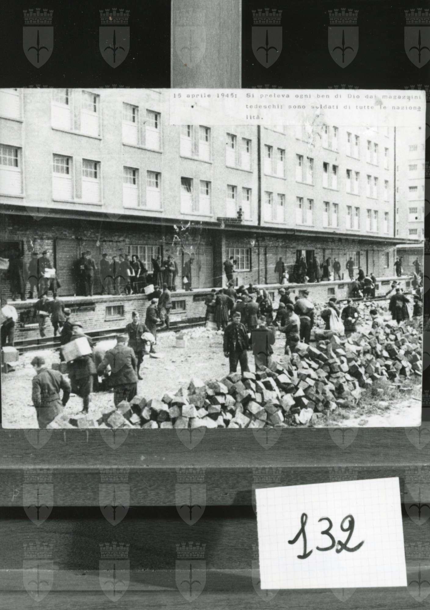 15 aprile 1945. Si preleva ogni ben di Dio dai magazzini tedeschi: sono soldati di tutte le nazionalità.