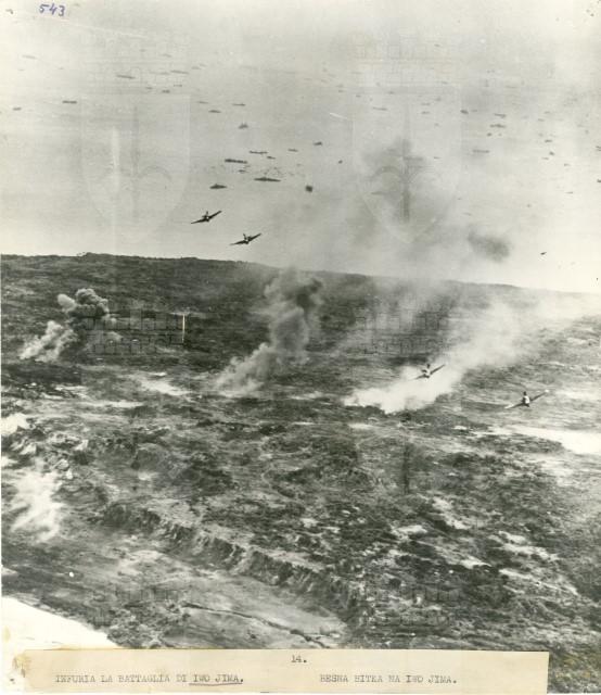Bombardamento aereo sul territorio di Iwo Jima. Visibili alcuni aerei militari americani