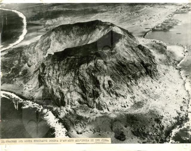 Veduta dall'alto del vulcano Monte Suribachi. In secondo piano navi americane approdate sulle spiaggia e impegnate nella battaglia di Iwo Jima, scoppiata nel febbrario 1945