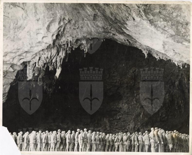 In una delle grandi grotte naturali della provincia cinese di Kwangsi, il generalissimo Chiang Kai-shek fonda un centro di addestramento della fanteria durante la guerra, per evitare che le sue reclute vengano uccise dai giapponesi. Nella foto Chiang si rivolge alle reclute.