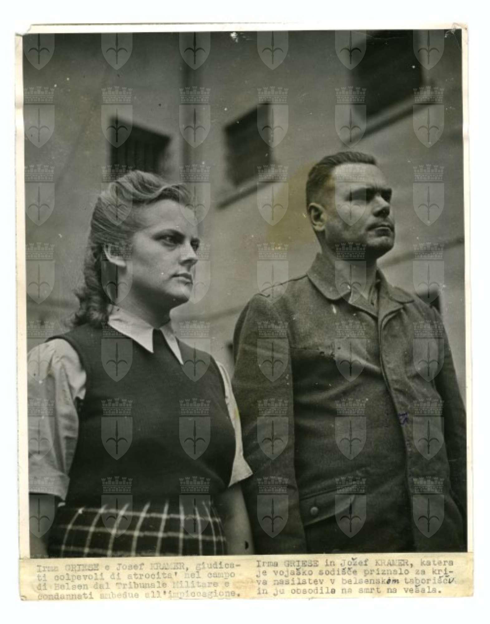 L'immagine mostra l'imputato Irma Grese e l'ex comandante del campo Josef Kramer di fronte alla prigione di Celle, in Germania. Il comandante e le guardie del campo di concentramento di Bergen-Belsen furono processati per la morte di oltre 50.000 detenuti nel cosiddetto processo di Belsen presso il tribunale militare britannico di Lueneburg, in Germania. Undici imputati furono condannati a morte il 20 novembre 1945.